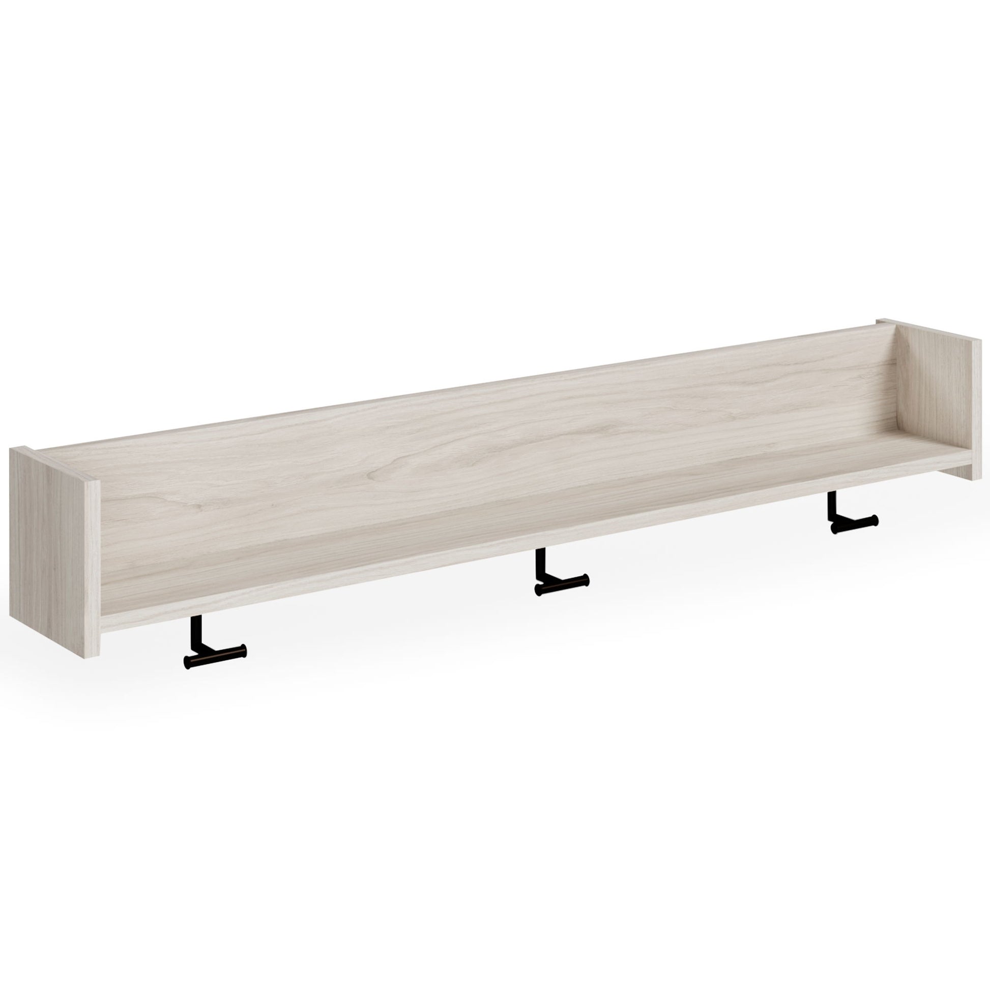 The sleek, minimalist look of this wall-mounted coat rack is fashionably contemporary and easy to integrate in a variety of living spaces. Three sturdy hooks and a spacious shelf are your new go-to spot for hats and scarves or displays. Whether by the front door or back entry, this coat rack keeps all-weather essentials well within reach.